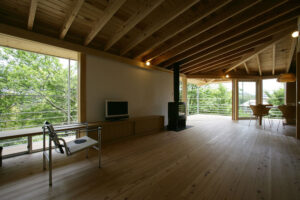薪ストーブの赤い炎が木の梁をやわらかく照らし、無垢フローリングに広がる木の香りと、大開口サッシ越しに借景する深い緑が、一年中心安らぐ癒しの住まいを実現。朝日を取り込み、家族の団欒を優雅に彩る新築施工事例です。